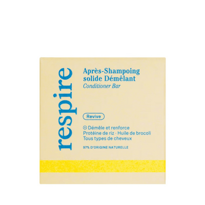 L'après-shampoing solide bio Respire est formulé sans ingrédients chimiques pour apporter un petit plus à votre chevelure : douceur, démêlage et cheveux brillants 😊