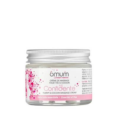 La Confidente d'Omum est une crème de massage fouettée, idéale pour toutes les peaux en quête de réconfort et de douceur, notamment durant la grossesse.